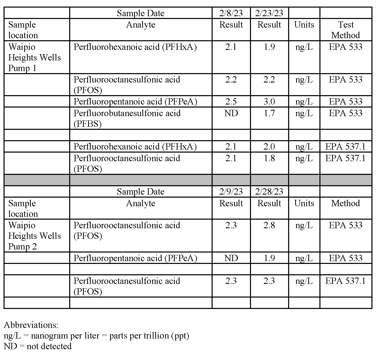 HONOLULU - The Board of Water Supply (BWS) has confirmed the low-level detection of various perfluoroalkyl substances (PFAS) at its Waipio Heights Wells Pumping Station. The type of PFAS and level detected is shown below based on samples collected in February 2023. The BWS reported the findings to the Hawaii Department of Health on 3/17/23 in accordance with Hawaii State Law.