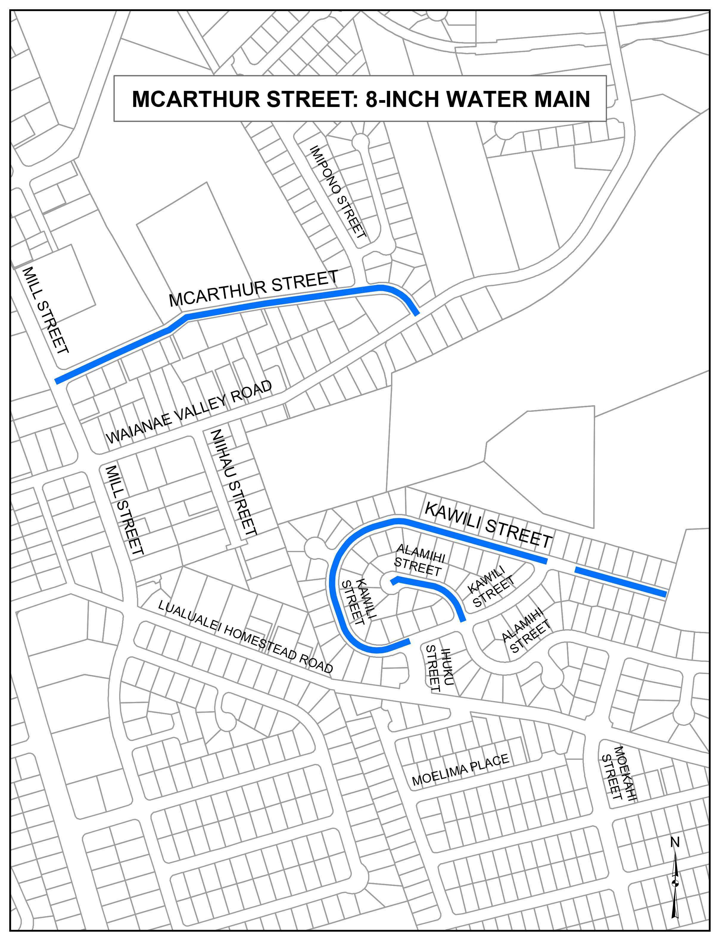 The project will replace approximately 1,500 feet of water mains along McArthur Street from Mill Street to Waianae Valley Road, 1,500 feet of water mains along Kawili Street from Ihuku Street to end, and 500 feet of water mains along Alamihi Street from Kawaili Street to end.