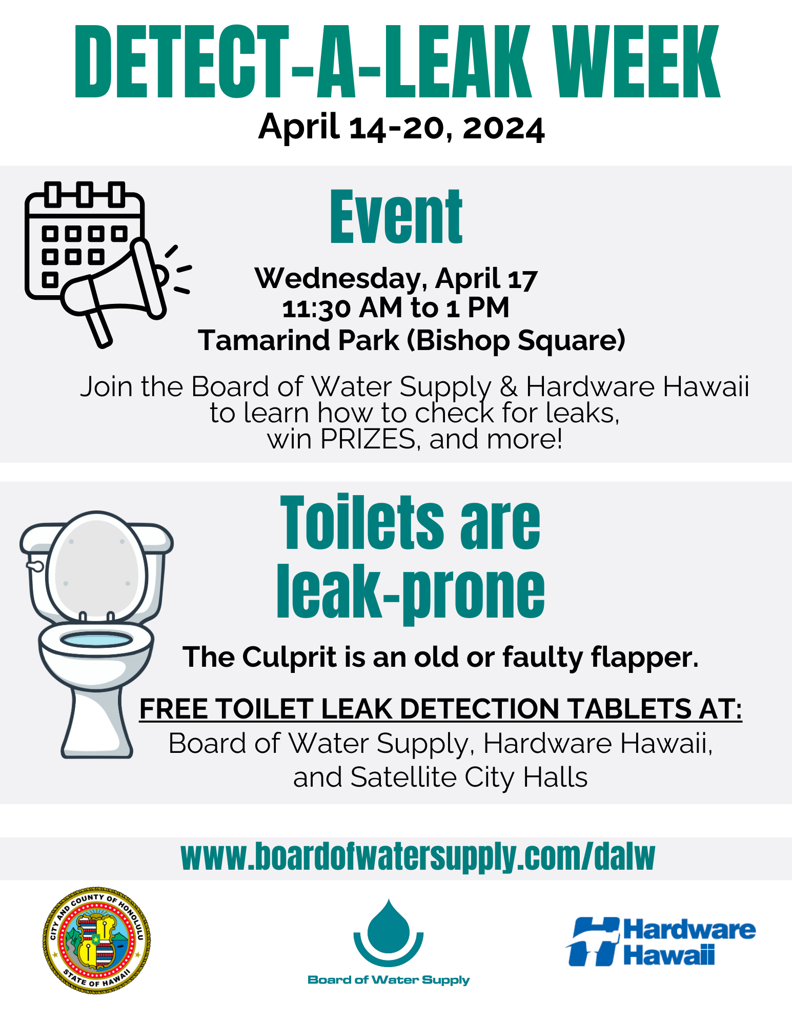 - April 17, 2024, stop by the Detect-A-Leak Week and Hardware Hawaii booths from 11:30 AM to 1 PM, at Tamarind Park (Bishop Square) in Downtown Honolulu. Find ways to detect and repair leaks, take home BWS and Hardware Hawaii swag, and win prizes.